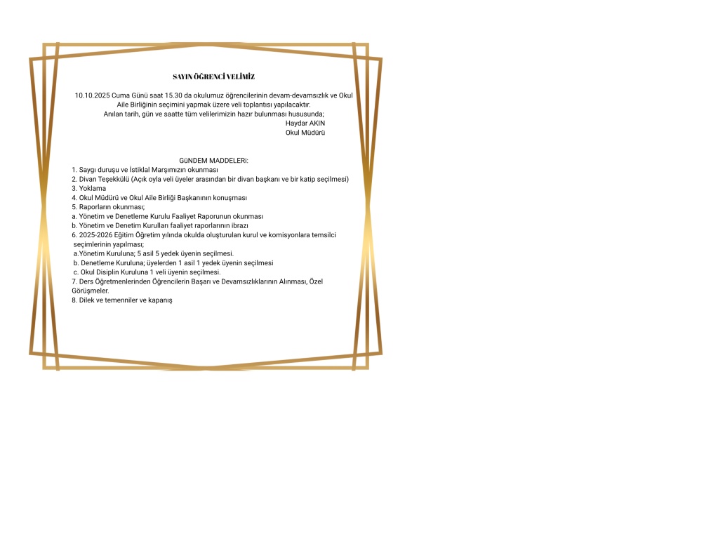 Okulumuzun 10.10.2025 Cuma Günü saat 15.30 da öğrencilerimizin devam devamsızlık ve Okul Aile Birliğinin seçimini yapmak üzere veli toplantısı yapılacaktır.Tüm velilerimizin katılımını bekliyoruz.